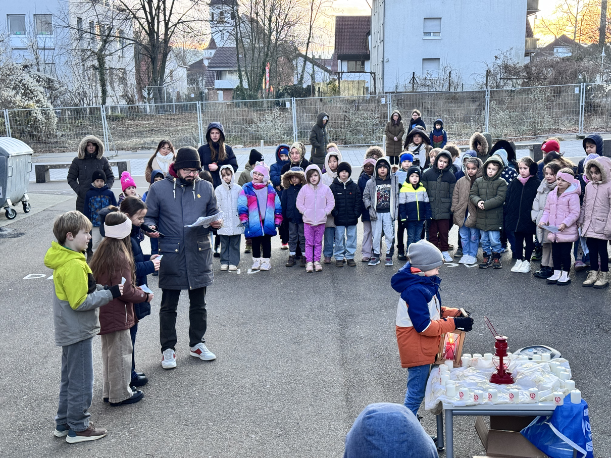 Am heutigen Morgen war das Friedenslicht aus Bethlehem zu Gast auf dem großen Schulhof der Silcherschule. In einer stimmungsvollen gemeinsamen Feier versammelten sich Schülerinnen und Schüler, Lehrkräfte und Mitglieder der Schulgemeinschaft, um das Licht des Friedens zu empfangen und weiterzugeben. Musikalisch eröffnet wurde die Veranstaltung von der Bläserklasse unter der Leitung von Marc Pöthig. Nach